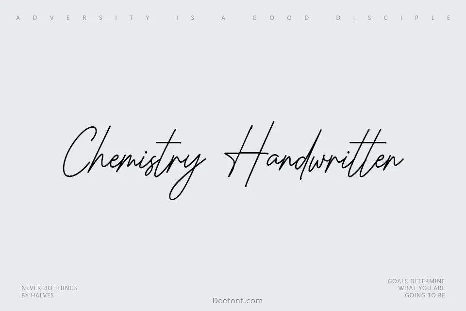 Chemistry Handwritten Font is a modern, flowing script that mimics an elegant handwritten signature. Smooth curves, varied stroke widths, and natural letter connections give it a refined yet personal feel, ideal for branding, logos, packaging, wedding stationery, quotes, and standout social media titles.
