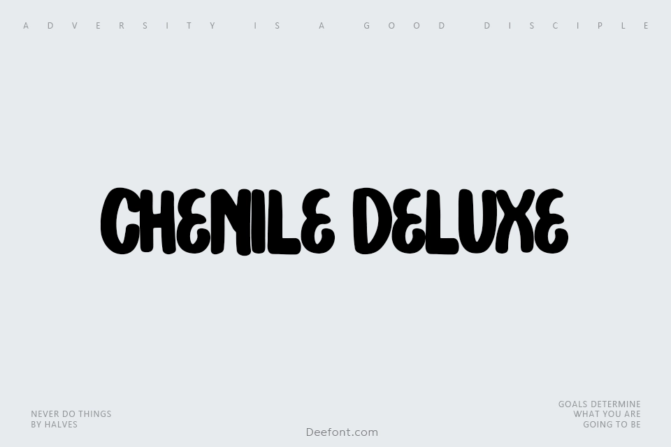 Chenile Deluxe is a bold, handwritten display font duo designed for dynamic creative projects. This retro-styled typeface reads as strong, confident, and playful, featuring charming vintage character perfect for branding, packaging, logotypes, headlines, and quotes. With comprehensive multilingual support and stylistic alternates, Chenile Deluxe brings nostalgic warmth and expressive energy to any design application requiring distinctive personality and visual impact.