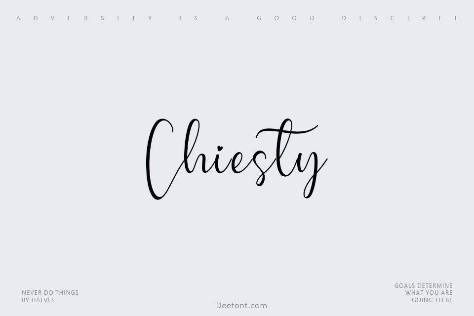Chiesty is an elegant script font that brings sophistication and romance to your designs. With graceful curves and delicate strokes, this handwritten-inspired typeface is perfect for wedding invitations, branding projects, and decorative applications. Created with modern calligraphy influences, Chiesty combines classic charm with contemporary aesthetics, making it an ideal choice for adding a personal touch to logos, social media graphics, and creative projects that demand refined elegance and artistic flair.
