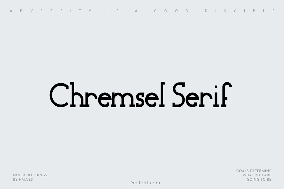 Chremsel Serif is a classic and elegant serif typeface designed with geometric precision and refined aesthetics. Featuring strong vertical lines, subtle curves, and bilateral serifs, this font combines modern sophistication with timeless appeal. The well-defined bowls, graceful descenders, and delicate hairline strokes create a balanced and harmonious appearance suitable for headlines, branding, editorial design, and professional typography projects seeking both elegance and clarity.