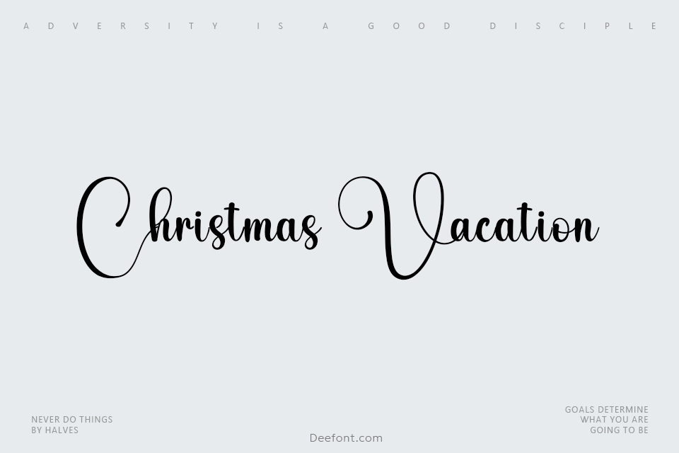 Christmas Vacation is a captivating calligraphy script font designed with semi-light weight, perfect for holiday-themed designs. Its flowing strokes and intricate details evoke warmth and joy, making it ideal for Christmas cards, party invitations, and festive banners. The decorative elements and unique flair add charm to seasonal greetings and winter-themed branding materials, transforming your projects into merry works of art that celebrate the spirit of the holiday season