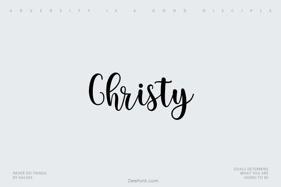 Christy is an exquisite calligraphy script font featuring elegant flowing strokes and intricate swashes. This charming typeface combines semi-light weight sophistication with graceful curves, making it ideal for romantic and upscale design projects. Perfect for wedding invitations, luxury branding, and elegant editorial pieces, Christy‘s ornate details and refined letterforms elevate any design to new heights of refinement and beauty.