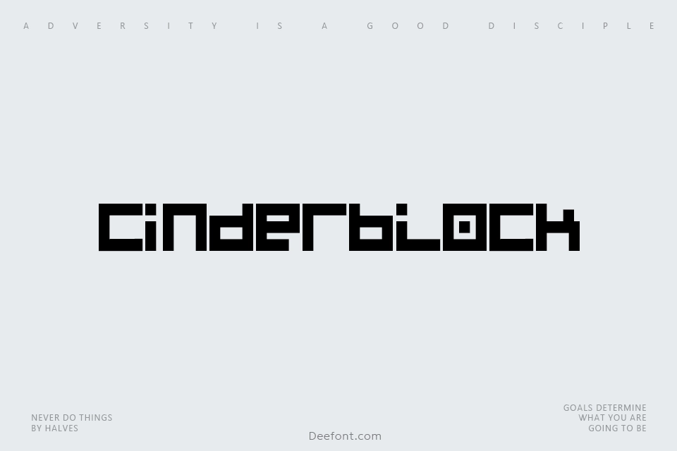 Cinderblock is a bold, geometric display font inspired by masonry and architecture, featuring ultra-thin white spaces that create a striking spatial rhythm between letterforms. Designed with symmetrical proportions, this sans serif typeface excels at headlines and display purposes, supporting 43 languages with 300+ glyphs. The distinctive rectangular construction of each character produces a structured, modern aesthetic ideal for contemporary design projects.