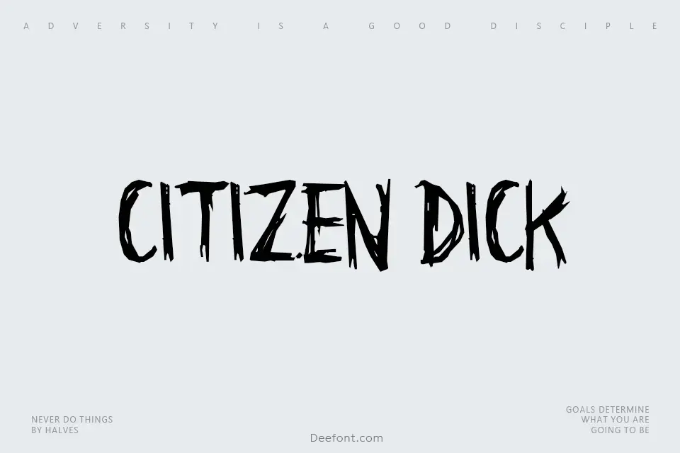 Citizen Dick is a bold, distressed display font featuring hand-drawn letterforms with a worn, graffiti-inspired appearance ideal for creating eye-catching headlines, music artwork, alternative branding, and edgy poster designs. The font’s raw energy and textured aesthetic make it particularly effective for horror movie titles, punk rock graphics, and designs demanding visual intensity and character. Its irregular strokes and rough finish deliver authenticity perfect for projects targeting alternative audiences and unconventional design aesthetics.