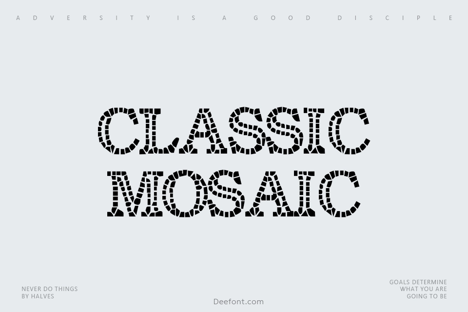 Classic Mosaic is a striking display font where each letter is meticulously crafted from tiny, densely packed square tiles, creating a rich textured effect reminiscent of detailed mosaic artwork. With prominent serifs and a bold, sophisticated aesthetic, this decorative typeface combines classic vintage charm with geometric precision. The font’s unique tile-based structure makes it ideal for eye-catching logos, posters, and creative projects that demand distinctive visual impact and artistic flair.