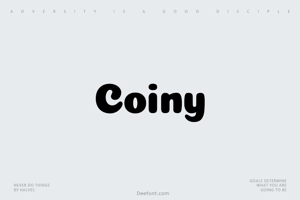 Coiny is a bold, geometric sans-serif display font featuring playful and expressive rounded forms inspired by urban vernacular design and street art. This decorative typeface combines simple geometrical shapes with brush-like strokes, creating a fun and approachable aesthetic ideal for striking headlines, titles, and creative projects. With extensive language support including Latin, Cyrillic, Tamil, and Vietnamese scripts, Coiny delivers a modern, dynamic feel perfect for casual and friendly applications where visual impact matters.