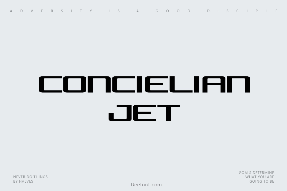 Concielian Jet is a futuristic and geometric typeface featuring sharp edges and clean lines that deliver a sleek, modern aesthetic. This sci-fi inspired display font combines angular character structures with consistent proportions, making it ideal for tech-focused branding, digital interfaces, video game design, and contemporary creative projects. With its distinctive techno styling and geometric precision, Concielian Jet brings a professional and visually striking presence to headlines, logos, and futuristic-themed designs. The font’s balanced character spacing and dynamic feel make it an excellent choice for projects requiring cutting-edge typography and technological sophistication.