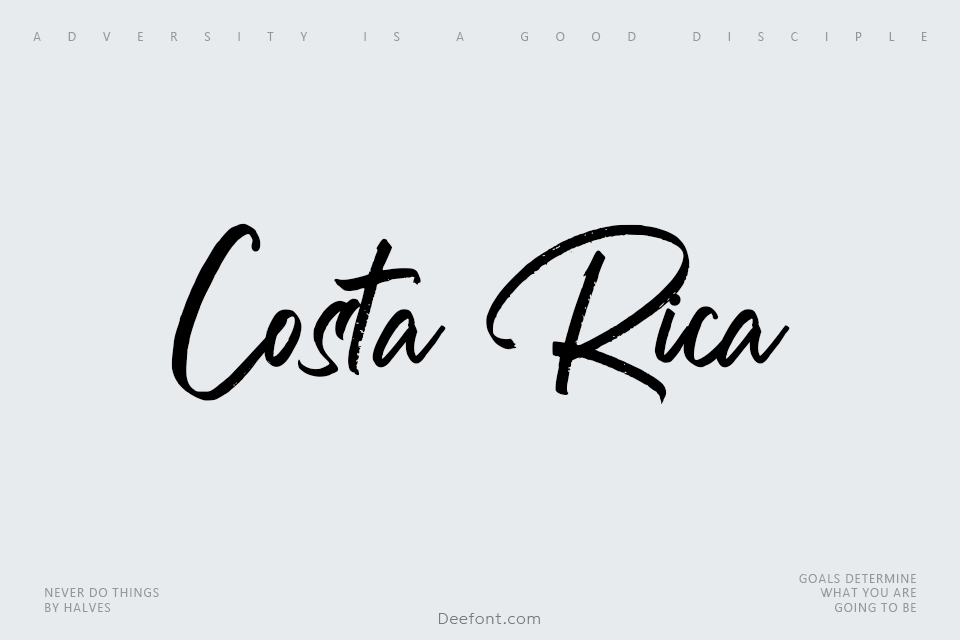 Costa Rica is a handwritten brush font created with natural brush texture, designed to elevate your creative projects with powerful and beautiful typography. The font features organic textures and natural brush strokes, making it ideal for branding, quotes, and t-shirt designs. Supporting multilingual characters with alternates and swashes, Costa Rica brings artistic flair and authenticity to any creative application.