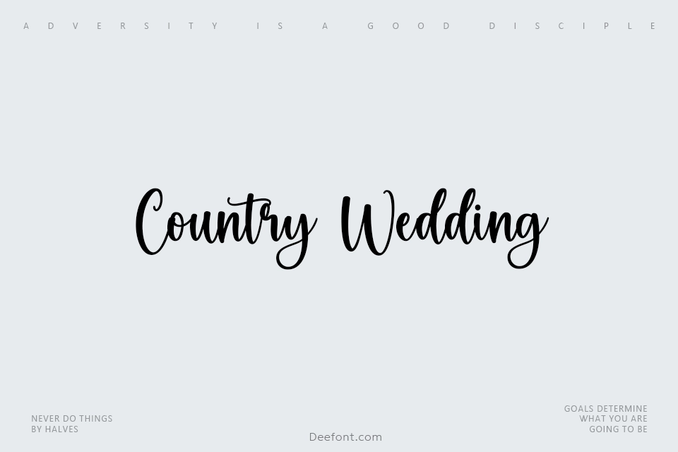 Country Wedding is an elegant script font that brings a charming handwritten aesthetic perfect for weddings and special occasions. With its graceful flowing lines and organic structure, this sophisticated typeface captures the essence of romantic elegance. Ideal for invitations, branding, and personal correspondence, it seamlessly blends casual warmth with polished sophistication. The font’s natural appeal and authentic character make it perfect for boutique designs, event signage, and any project requiring a personal, artistic touch while maintaining excellent readability and refined grace.