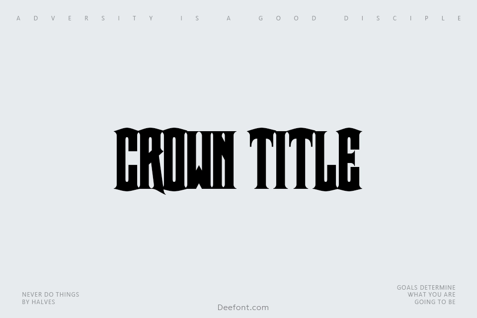 Crown Title is a distinctive gothic-modern serif typeface created by Jonathan Paterson, featuring bold, square letterforms with a regal and distinctive character. This classic serif font combines angular edges with striking proportions, making it ideal for titles, headings, and display purposes where a vintage, decorative aesthetic is desired. With its elegant yet commanding presence, Crown Title serves as a versatile choice for creative projects requiring visual impact and sophisticated typography.