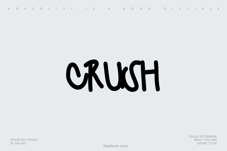 Crush is a bold and expressive handwritten font characterized by its thick strokes and playful, informal appearance. Created by Des Gomez, this font features rounded letters with casual, energetic flair. The consistent uppercase and lowercase styling, combined with curves and loops, makes it ideal for greeting cards, posters, children’s books, and creative branding projects. Perfect for designs requiring a personal, dynamic touch with eye-catching appeal.