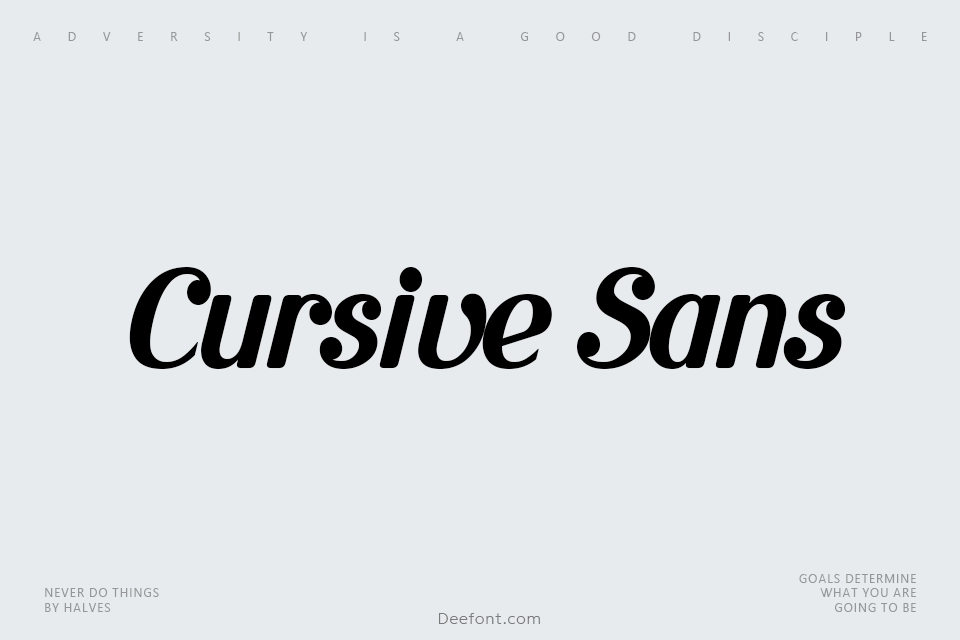 Cursive Sans is a distinctive cursive-sans serif font designed by Polish typographer Wojciech Kalinowski. This elegant typeface blends cursive and sans-serif aesthetics, featuring slanted uppercase letters with dynamic fluid appearance and consistent lowercase flow. Created originally for stone inscriptions, the font combines sophistication with readability, making it ideal for creative typography projects. With 409 glyphs supporting multiple languages and an oblique style variant, Cursive Sans offers versatile applications in branding, invitations, and editorial design. The modern aesthetic balances approachability with refined character design.