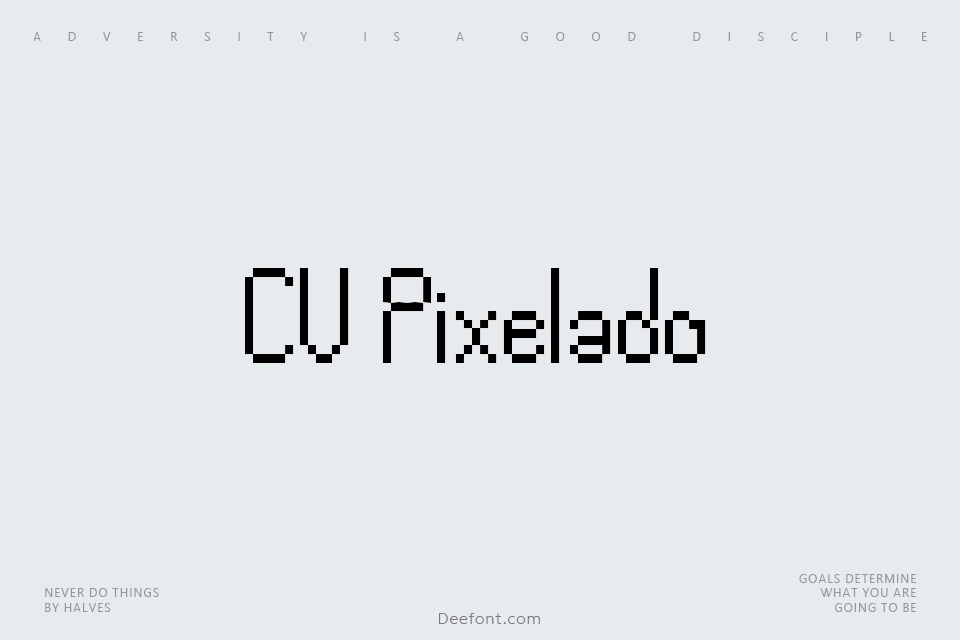 CV Pixelado is a distinctive bitmap font featuring a pixelated, retro-style design with geometric grid-like characters. Created at 32 pixels, each letter is composed of small square blocks reminiscent of early digital displays and classic video games. The font maintains consistent character height with uniform pixelated edges, offering a nostalgic aesthetic perfect for vintage digital projects, retro gaming designs, and creative works seeking an authentic 8-bit visual appeal. With 188 glyphs supporting multiple character sets, this font delivers a structured and playful appearance ideal for headlines, logos, and digital artwork.