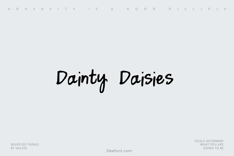 Dainty Daisies is a delicate handwritten script typeface that captures the charm and warmth of casual penmanship. With its organic letter forms, flowing stroke work, and playful character, this font brings an authentic hand-lettered aesthetic to any design project. The whimsical, feminine appearance features gently curved strokes and natural variations that evoke a sense of springtime freshness and carefree creativity. Ideal for greeting cards, wedding invitations, social media graphics, poster design, and decorative text elements, Dainty Daisies combines elegance with approachability, making it perfect for projects requiring a personal touch and artistic flair.