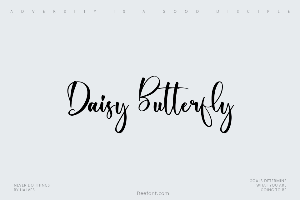 Daisy Butterfly is an elegant and romantic calligraphy font featuring delicate curves and flowing lines that create a feminine and sophisticated feel. Designed by FreshtypeINK, this semi-light script typeface is perfect for wedding invitations, greeting cards, and formal designs. Its playful yet refined character also makes it suitable for whimsical projects like children’s book covers and beauty brand designs. With its unique dancing baseline and eye-catching appeal, Daisy Butterfly brings luxury and charm to any creative project.