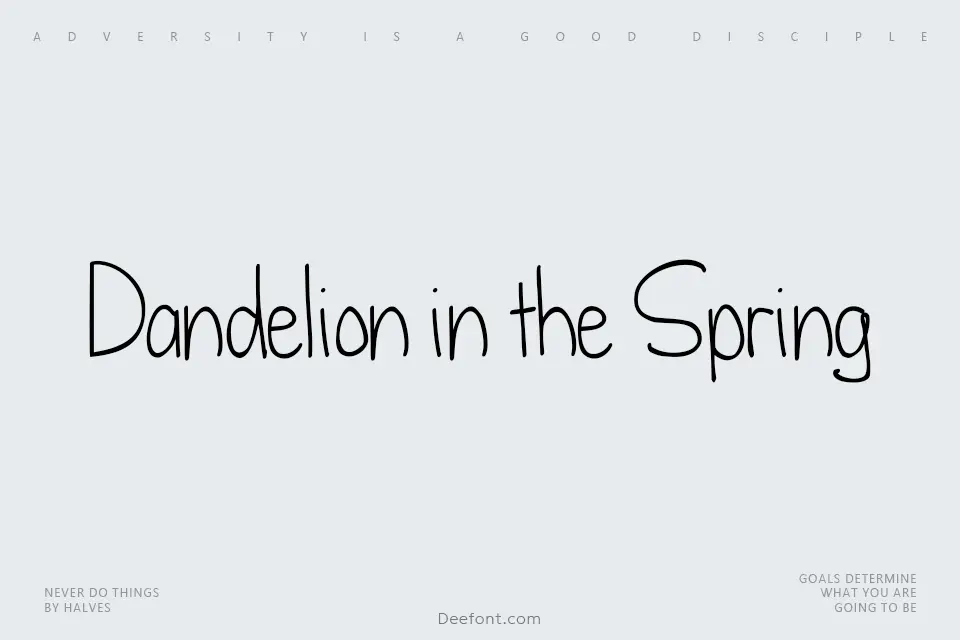 Dandelion in the Spring is a delightful handwritten script typeface that brings organic charm and artistic flair to your creative projects. Featuring flowing, natural letterforms with a light, feminine aesthetic, this versatile font excels in spring-themed branding, greeting cards, wedding invitations, and decorative posters. The sweet and simple character design creates an approachable, friendly atmosphere perfect for personal stationery, packaging design, and display applications. Whether you’re crafting botanical-inspired layouts or adding a handcrafted touch to seasonal campaigns, this elegant script captures the essence of springtime renewal and natural beauty, making it an ideal choice for projects requiring warmth and authenticity.