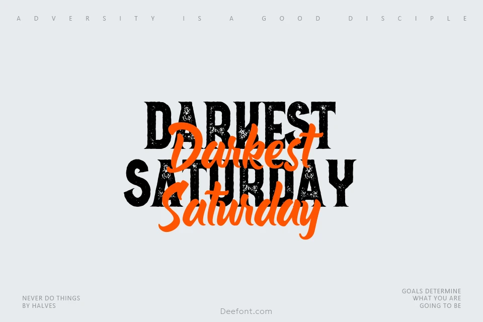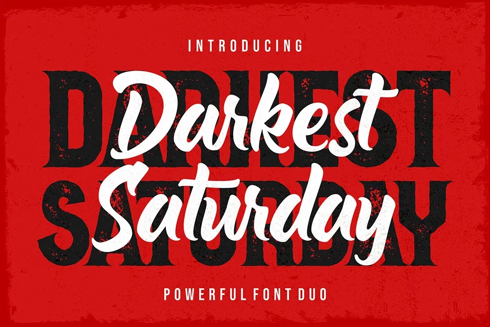 Darkest Saturday Font Family is a bold and dynamic font duo that combines strong vintage-inspired serif characters with elegant script lettering. This powerful pairing creates a striking contrast, making it perfect for eye-catching designs such as logos, posters, headlines, branding, and merchandise. The serif font exudes strength and grit with its textured and bold appearance, while the script font adds a touch of sophistication and fluidity. Together, they offer versatility and creativity for both modern and retro-themed projects. Darkest Saturday Font Family is ideal for designers seeking a unique combination of power and elegance to make their work stand out.