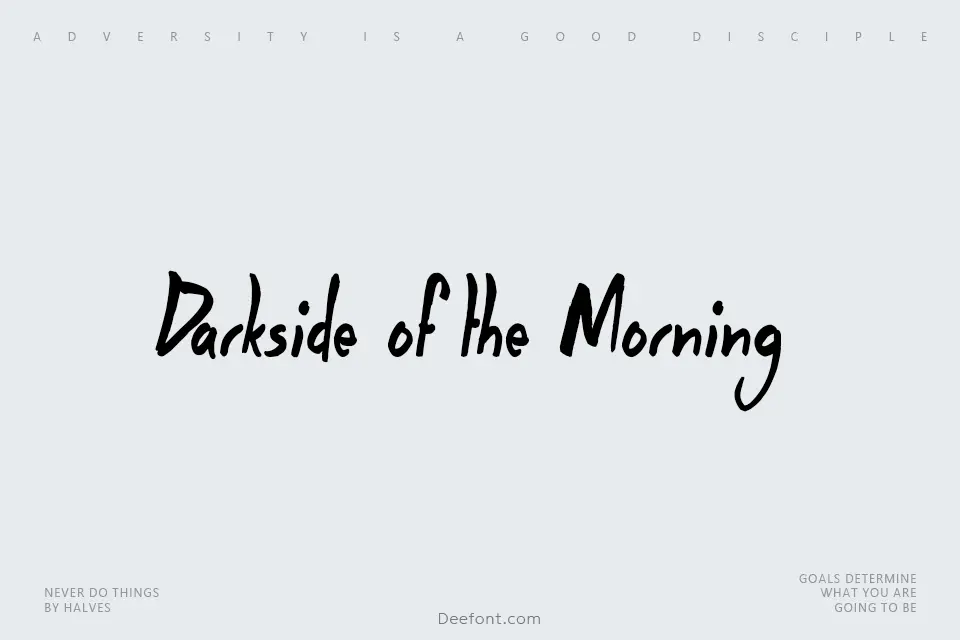 Darkside of the Morning is a distinctive handwritten script typeface that combines organic, flowing letterforms with a moody, theatrical character. This display font features irregular strokes and expressive curves that evoke a sense of eeriness and drama, making it ideal for horror movie titles, Halloween-themed designs, music album covers, and artistic poster work. With its hand-crafted aesthetic and bold personality, the font excels at commanding attention in headlines and display applications while maintaining legibility across various scales and mediums.