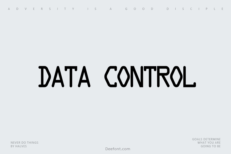 Data Control is a geometric, futuristic font designed by Vic Fieger, featuring bold and angular letterforms with consistent stroke widths. This modern typeface offers a clean, uniform appearance perfect for digital applications, technology branding, and contemporary design projects. With its minimalist aesthetic and technical feel, Data Control delivers exceptional legibility in digital interfaces, web design, and modern typography applications.