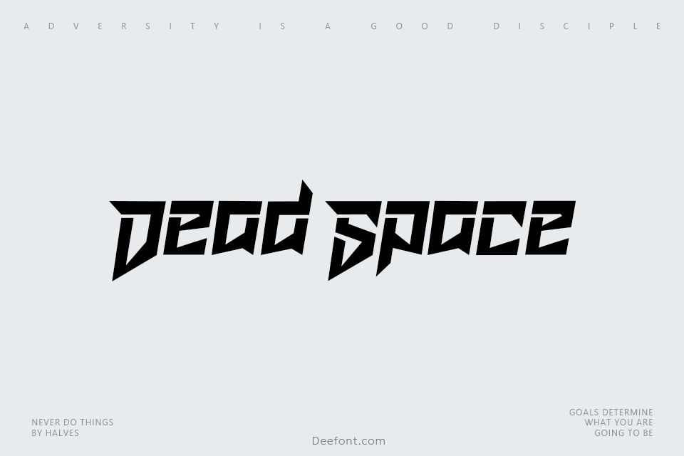 Dead Space is a striking geometric sans-serif typeface crafted by DC-designs. This futuristic font features bold, angular letterforms with a sci-fi aesthetic that makes it perfect for tech-related designs, gaming interfaces, and creative projects demanding a contemporary edge. With its clean lines and squared-off shapes, Dead Space delivers legibility alongside visual impact, embodying a modern and futuristic appeal ideal for display and poster work.