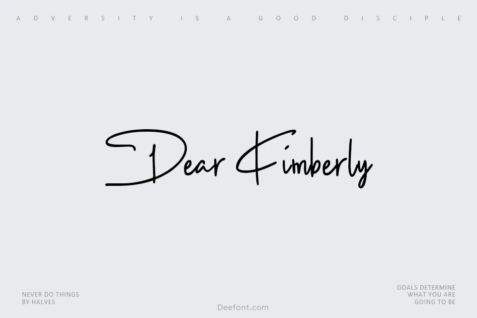 Dear Kimberly Font is an elegant and modern handwritten script typeface that exudes charm and sophistication. Its smooth, flowing strokes and carefully crafted letterforms make it perfect for a wide range of creative projects, including branding, wedding invitations, social media posts, and personal stationery. The font’s natural and stylish aesthetic adds a personal touch to any design while maintaining readability and professionalism. Ideal for conveying warmth and individuality, Dear Kimberly Font brings a sense of elegance and creativity to your text. Whether used for bold headlines or subtle accents, this typeface is a versatile choice for designers seeking timeless beauty.
