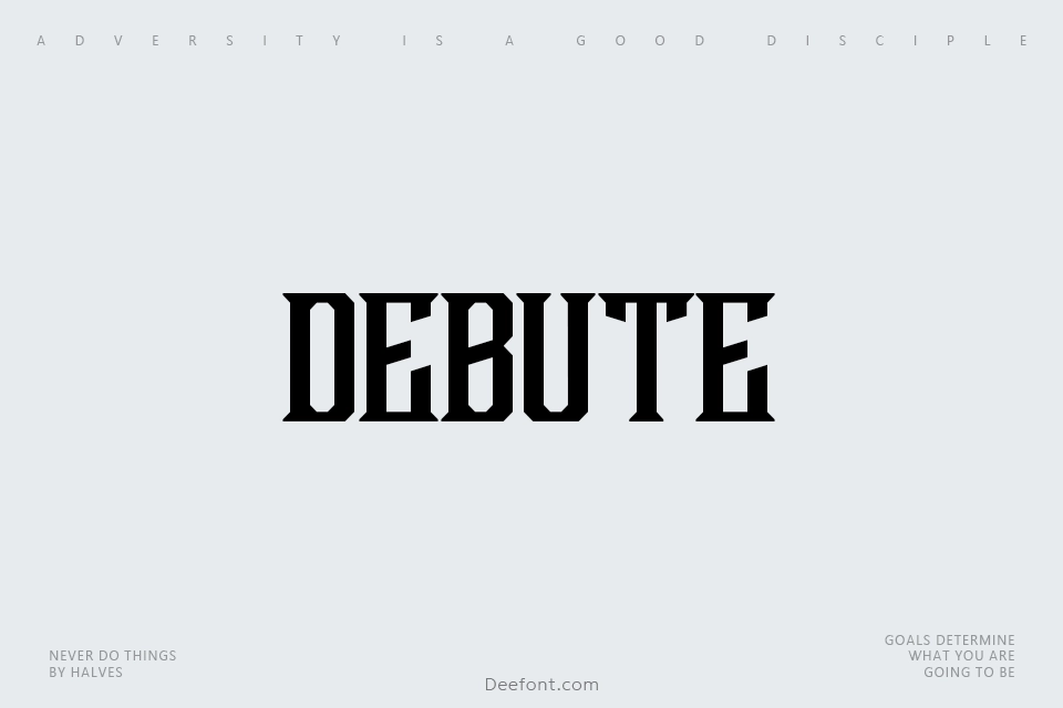 Debute is a captivating retro display typeface featuring bold, angular letterforms with sharp stylistic edges that make a powerful visual statement. Designed by Twicolabs Fontdation in 2013, this demo version delivers 102 glyphs with distinctive geometric character suitable for headlines, logos, posters, and eye-catching branding projects. Perfect for designers seeking a vintage aesthetic with contemporary edge, Debute combines nostalgia with modern sophistication in both decorative and display contexts.