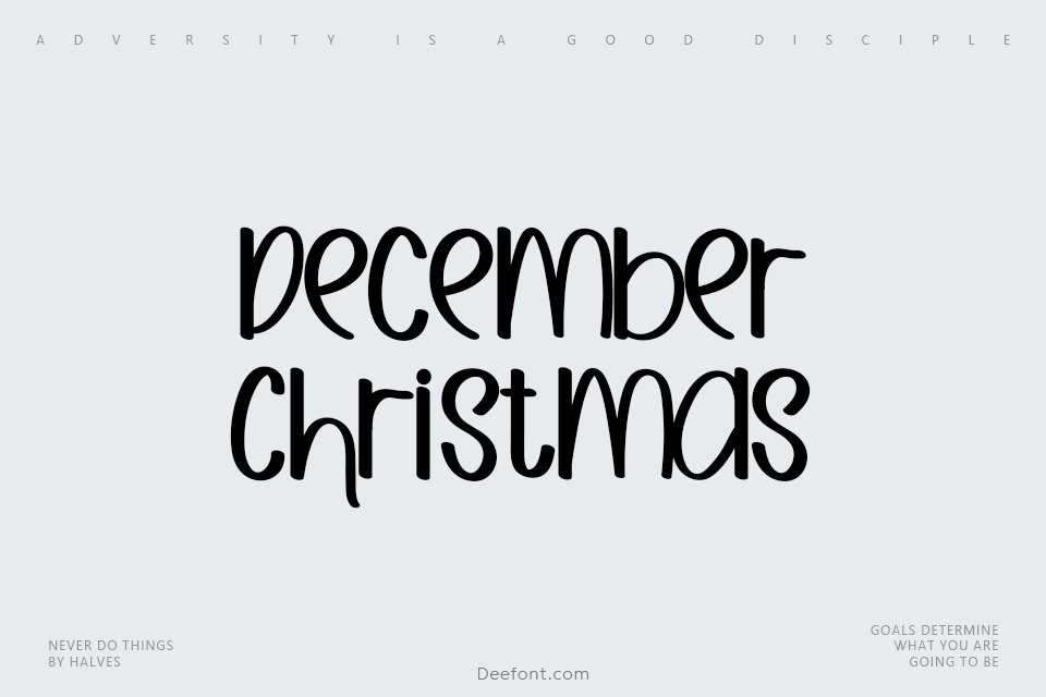 December Christmas is a playful and festive script font that brings holiday spirit to your designs. With its whimsical capitalization and decorative charm, this typeface captures the joy and warmth of the Christmas season. Perfect for holiday greetings, festive invitations, and seasonal branding, the font combines artistic flair with readable letterforms that add personality to any winter-themed project. Ideal for creating memorable holiday designs with creative character.