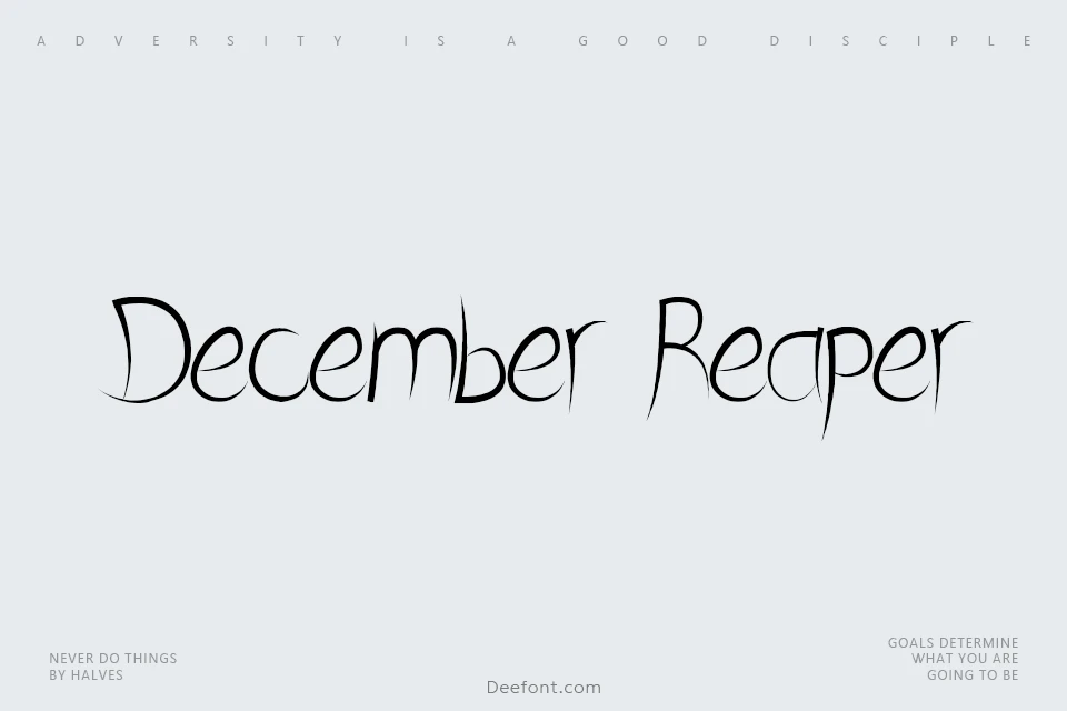 The December Reaper Font font features a distinctive, hand-drawn style with dramatic, elongated letterforms and a whimsical, slightly eerie character. Its unique appearance makes it ideal for creative projects that require an artistic, fantasy, or gothic flair. Perfect for posters, invitations, and branding that seeks to stand out with a touch of personality.
