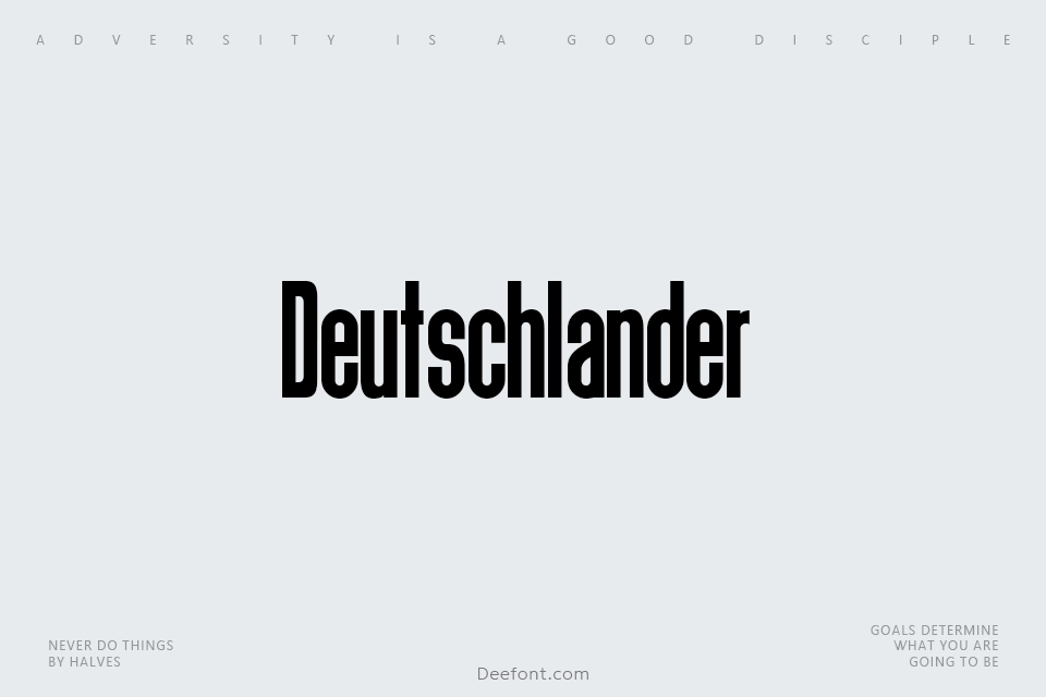 Hi everyone, and thanks for having a look. Tall, dark, and handsome Deutschlander will provide you with a clean typeface to insert when space is limited. The vertical nature of this extra condensed sans serif adds real estate to your subtitles and logos. Add Deutchlander to the bottom of a movie