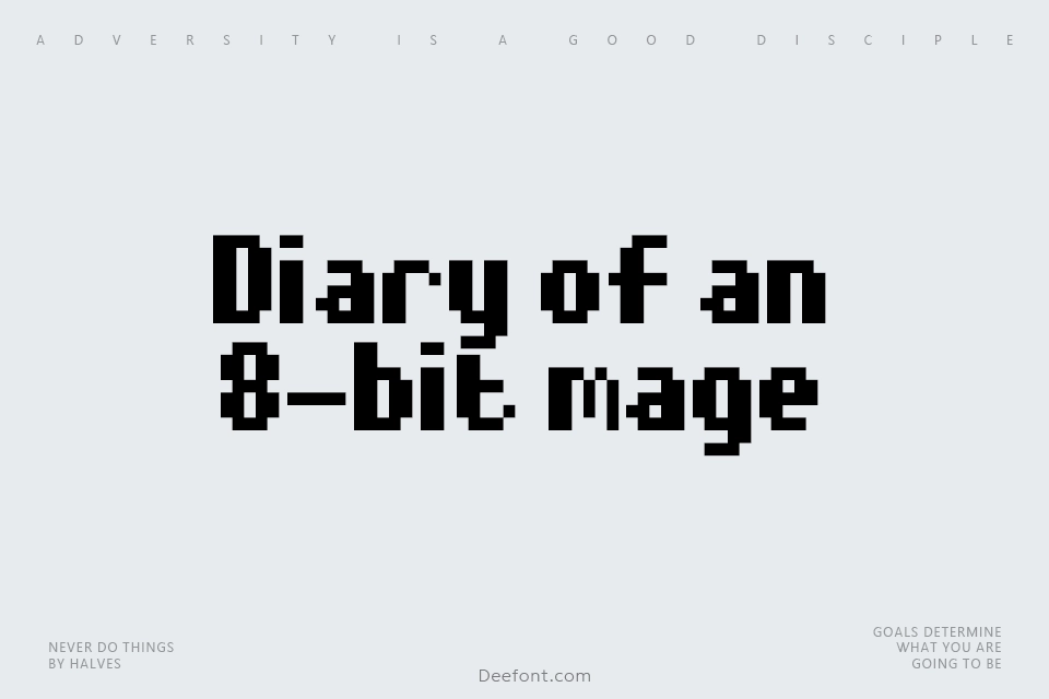 Diary of an 8-bit mage is a retro pixel bitmap display font that captures the nostalgic charm of classic 8-bit gaming aesthetics. With its characteristic blocky, pixelated letterforms rendered at 9px resolution, this distinctive typeface brings authentic vintage computing vibes to creative projects. Perfect for game design, retro-themed graphics, and digital compositions seeking playful vintage character and nostalgic appeal.