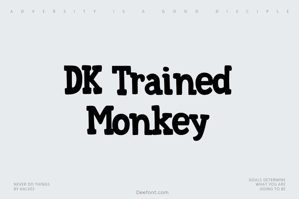 DK Trained Monkey is a playful and bold decorative display font featuring a whimsical, hand-drawn style with rounded edges and monkey motifs. Designed with irregularly shaped characters, this font combines lighthearted charm with a touch of quirkiness, making it perfect for children’s books, playful branding, creative posters, and fun invitations. The font maintains consistent boldness across uppercase and lowercase letters while incorporating playful design elements that add personality to any creative project.