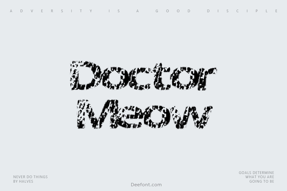 Doctor Meow is a distinctive display font created by Xerographer Fonts that combines eroded and distorted letterforms with a playful, whimsical character. This unique typeface is designed with a fancy style and organic texture, making it perfect for eye-catching typography projects that require personality and creativity. The font brings a fun, slightly weathered aesthetic to any design, offering a charming alternative to conventional typefaces for creative and entertaining visual communication.