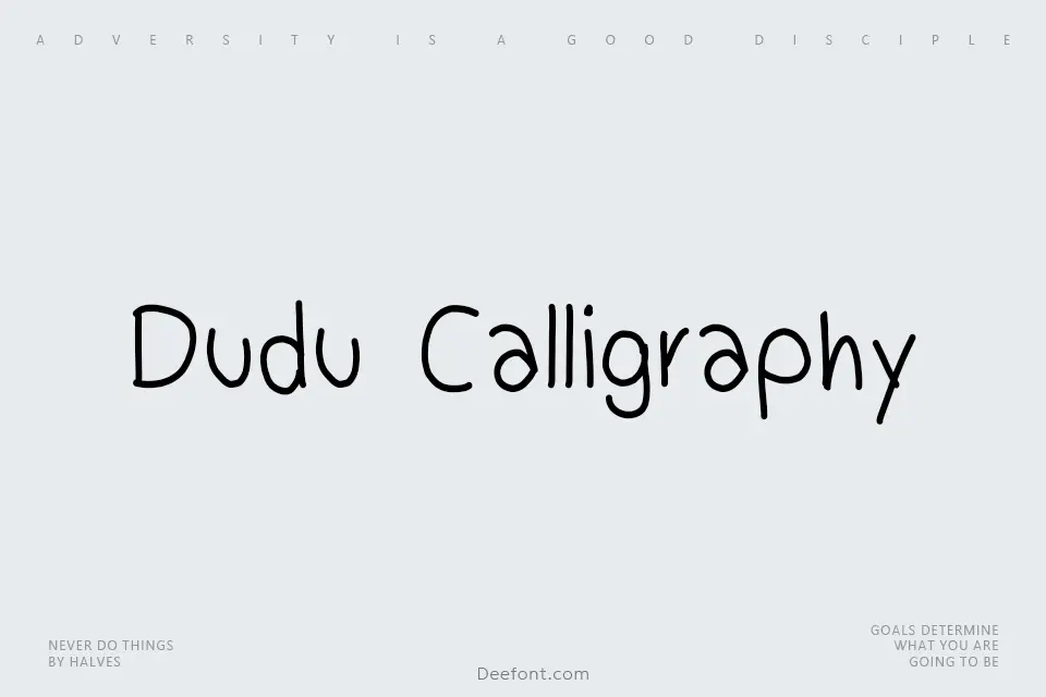 Dudu Calligraphy is a charming, free-to-download handwritten font featuring soft, rounded letterforms with distinctive calligraphic flourishes. Its playful, childish aesthetic makes it perfect for creative projects including posters, invitations, greeting cards, and decorative headings. The font’s gentle curves and informal style bring warmth and personality to titles, children’s books, and social media graphics, while its 175 characters support essential typographic needs for casual design work.