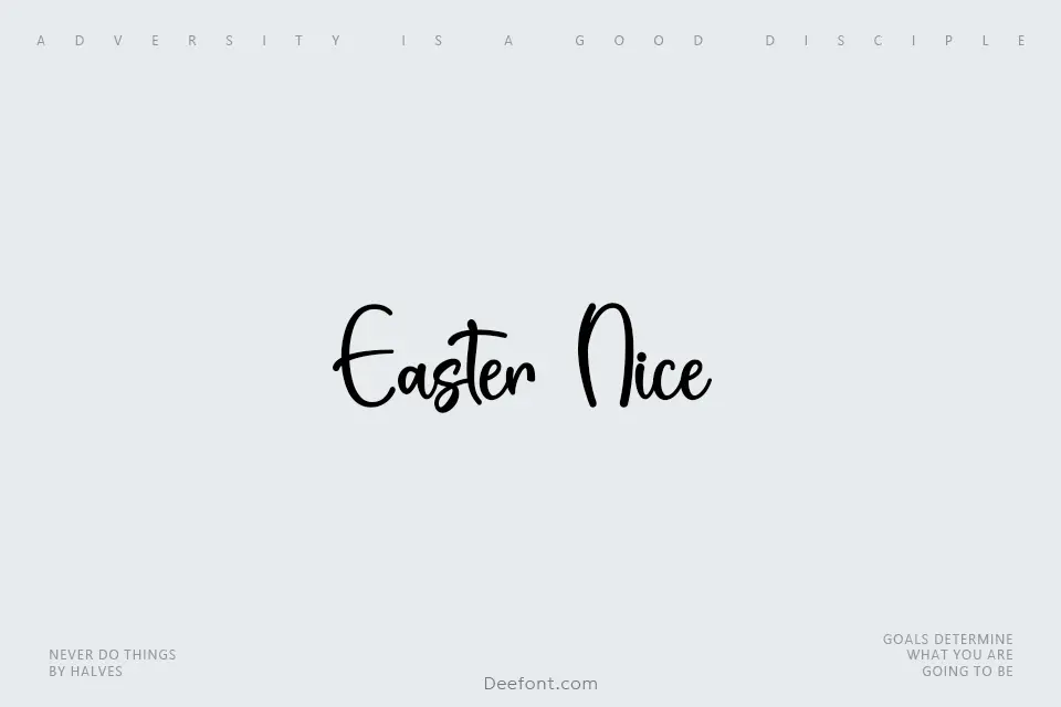The Easter Nice font is a charming and bouncy handwritten script designed to infuse your projects with joyful energy. Created by Alif Ryan Zulfikar, this typeface features smooth connections and a playful baseline, making it perfect for seasonal designs, greeting cards, and whimsical packaging. Its casual yet elegant calligraphy style ensures legibility while adding a personal, handcrafted touch to logos, headlines, and festive social media posts.