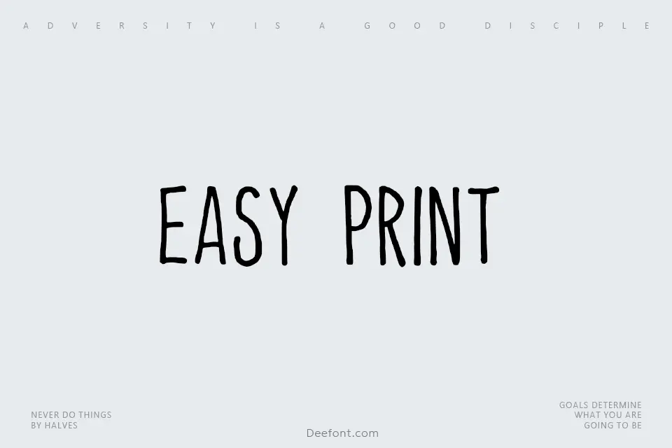 Easy Print is a contemporary handwritten display font showcasing distinctive printed uppercase letters with a semi-light weight and condensed character width. The font combines the informal charm of hand-drawn typography with clean block letterforms, making it ideal for eye-catching posters, personalized invitations, social media graphics, and creative headlines. Its casual aesthetic brings a fresh, personal touch to both print and digital designs while maintaining excellent legibility for display purposes.