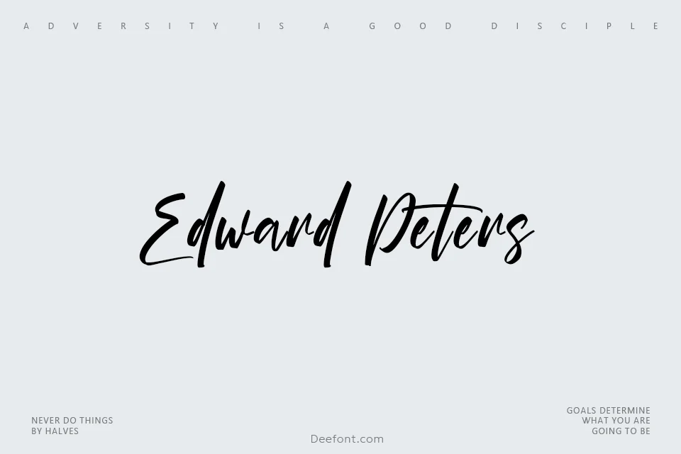 Edward Peters is an elegant and modern signature script font designed with high-contrast felt-tip strokes that deliver both sophistication and playfulness. This versatile brush typeface combines contemporary aesthetics with timeless calligraphic charm, making it ideal for branding, invitations, logos, and editorial designs. With its smooth, flowing letterforms and distinctive handwritten character, Edward Peters adds a touch of refinement and personality to any creative project while maintaining excellent readability across various applications.
