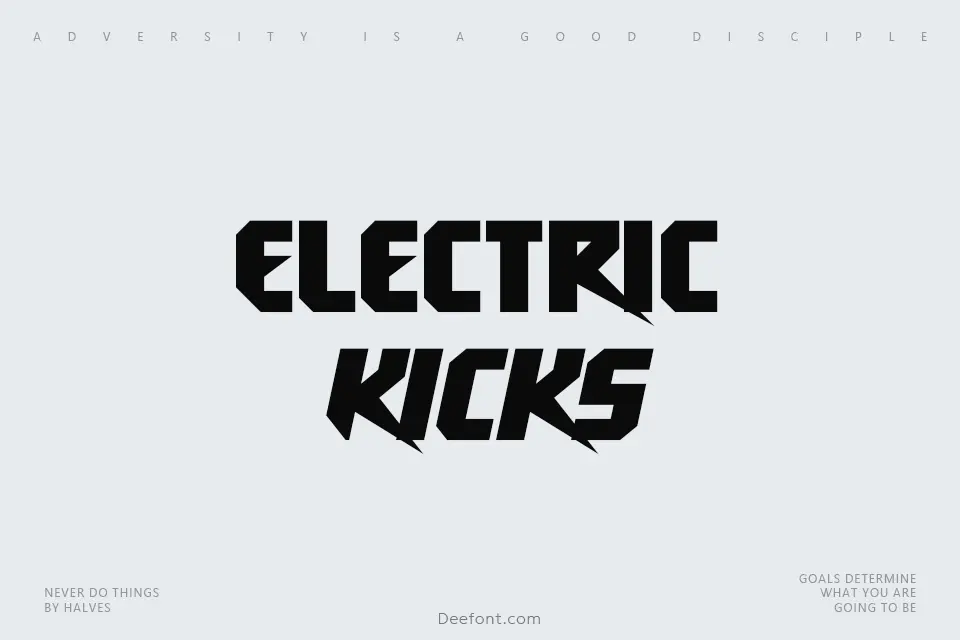 Electric Kicks is a bold, futuristic display font designed by Darrell Flood, featuring sharp angular lines and a dynamic geometric aesthetic. Its spiky, energetic style makes it ideal for sci-fi themes, gaming interfaces, tech-related branding, and edgy editorial designs. The font’s aggressive character shapes include angular terminals and stylized geometric forms, giving it a modern, high-impact visual presence.