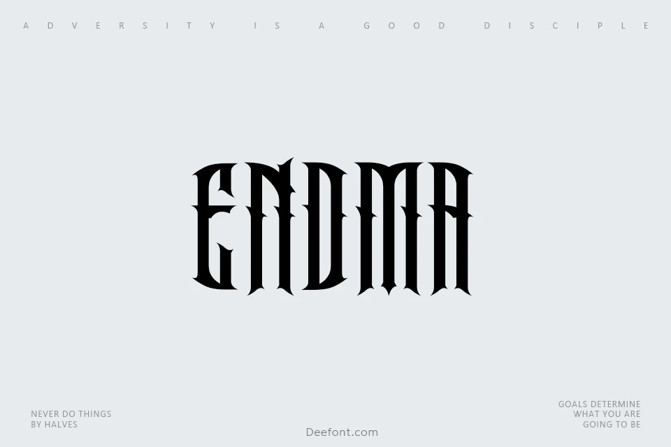 Endma Font is a bold, gothic-inspired display typeface characterized by its tall, jagged letterforms and vintage flair. Perfect for impactful headers, movie titles, logos, branding, sci-fi posters, packaging, and more, Endma Font draws attention with its dramatic and executive biker aesthetic. While it lacks lowercase letters, its striking uppercase design makes it ideal for projects that demand a powerful visual presence.