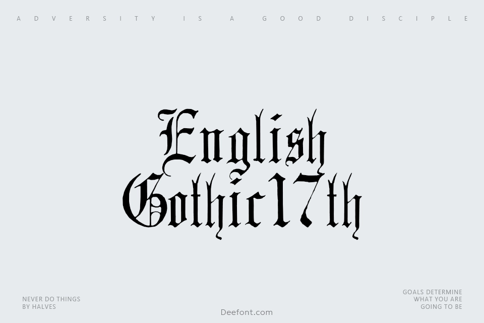 English Gothic, 17th c. is a detailed blackletter typeface inspired by Gothic script from the 17th century. Featuring sharp, angular lines and elaborate flourishes, this font embodies the intricate style characteristic of historical calligraphy. With its ornate uppercase letters adorned with decorative elements and stylized numerals, the font delivers a distinctly historical and formal appearance. Perfect for projects requiring traditional aesthetics, historical documents, formal invitations, certificates, and any design that evokes a sense of tradition, history, and formality. The consistent stroke width adds to its bold and authoritative presence, making it ideal for creating authentic vintage typography and decorative applications.