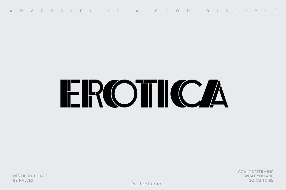 Erotica is a bold, modern display typeface crafted by Vladimir Nikolic, featuring distinctive curves and sharp angles ideal for sensual and romantic design applications. With five variable weights ranging from ExtraLight to Bold, this elegant font combines thick and thin hairlines to create visually striking typography perfect for packaging, posters, branding, and invitations. The typeface showcases contemporary elegance with smooth, flowing letterforms that bring sophistication and creativity to any creative project.