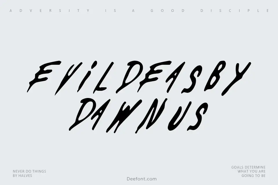 Evil Deas by Dawn US is a distinctive horror-inspired script font that brings menacing, distressed character to any dark creative project. With its eroded, gothic letterforms and evil aesthetic, this typeface excels at crafting spine-chilling movie posters, Halloween invitations, and sinister title graphics. The font’s rough, worn texture and supernatural feel make it ideal for horror-themed designs, game interfaces, and festival artwork. Perfect for designers seeking authentic scary typography for personal creative ventures.