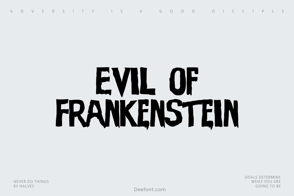 Evil of Frankenstein is a bold, chunky horror font featuring crooked and distorted characters that create a sense of dynamic energy and fear. Designed for creative projects requiring a freaky, festive aesthetic, this display font presents uniquely jagged letterforms perfect for horror-themed designs, Halloween celebrations, and eye-catching typography that demands attention and conveys supernatural appeal.