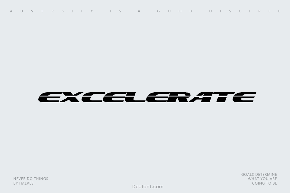 Excelerate is a dynamic and modern techno-sci-fi display font featuring a sleek, italicized design with sharp, angular edges and a futuristic aesthetic. Characterized by slightly condensed characters and unique cutouts with slashes that add a sense of motion and energy, this font is ideal for branding, sports team logos, automotive advertisements, and technology-related projects that require a contemporary and energetic feel.ffonts