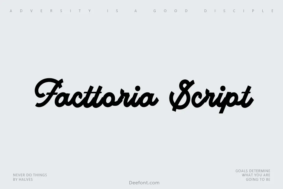 Facttoria Script is a bold calligraphic script font with thick, flowing strokes and a confident retro vibe. Its vintage sign-painting feel suits eye-catching logos, posters, packaging, storefronts and social media graphics, especially when a nostalgic, handcrafted personality is needed.