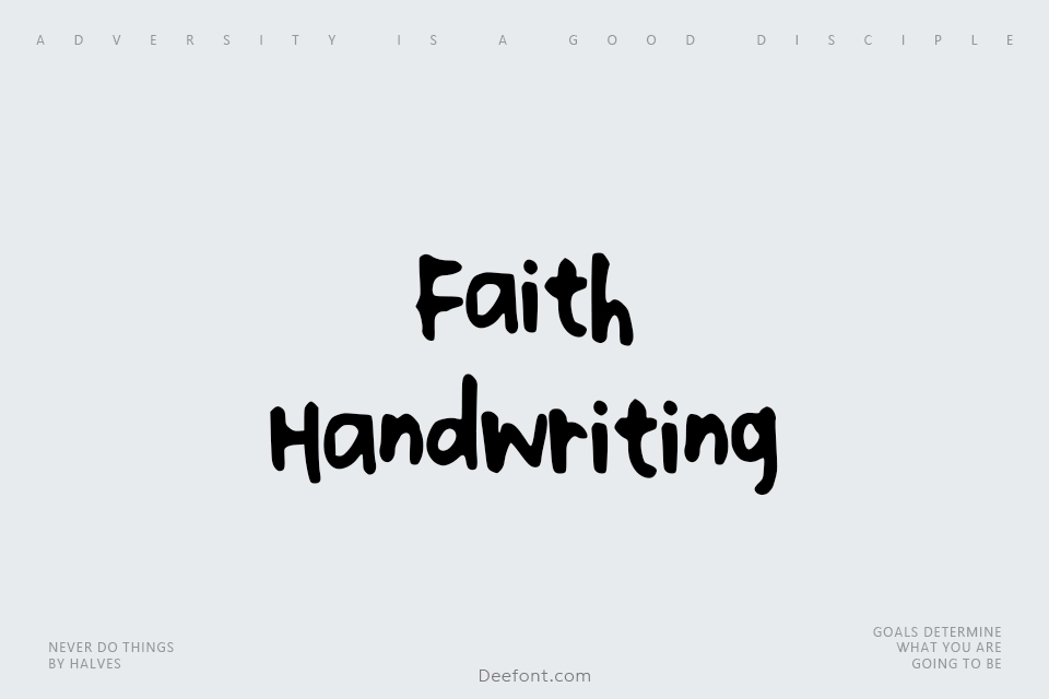 Faith Handwriting is a charming and casual handwritten font designed for adding a personal and friendly touch to your creative projects. With its relaxed script style, Faith Handwriting brings a sense of warmth and approachability to invitations, posters, quotes, greeting cards, or branding. Ideal for designers seeking a natural and authentic handwriting effect, this font stands out for its readability while maintaining a playful spirit. Compatible with various design applications, it is easy to use for both personal and creative endeavors.