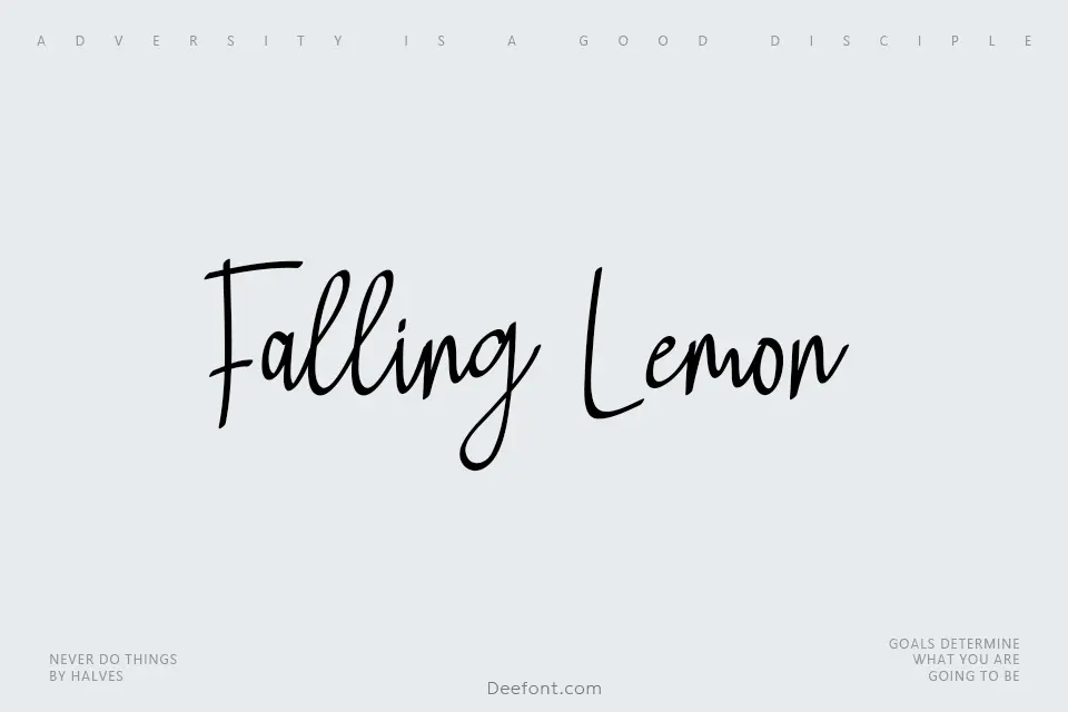 Falling Lemon is a natural handwritten font crafted with calligraphy pen strokes, delivering an authentic hand-drawn aesthetic with graceful, flowing letterforms. This semi-condensed script features elegant swashes, bouncy baselines, and expressive curves that bring warmth and personality to any design. Ideal for wedding invitations, greeting cards, logo design, branding projects, T-shirt prints, posters, and packaging, Falling Lemon combines casual charm with sophisticated calligraphic detail. Its friendly yet refined character makes it versatile for both formal occasions and creative, whimsical projects requiring a personal touch.
