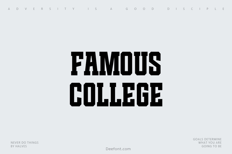 Famous College is a distinctive display typeface that captures the essence of traditional academic aesthetics with nostalgic charm. Designed to evoke old-school collegiate elegance, this condensed and bold font combines strength and character, making it perfect for educational institutions, sports teams, and retro-themed designs. Its striking letterforms deliver visual impact while maintaining readability, ideal for headlines, logos, promotional materials, and branding projects seeking to convey reliability and contemporary vibrancy.