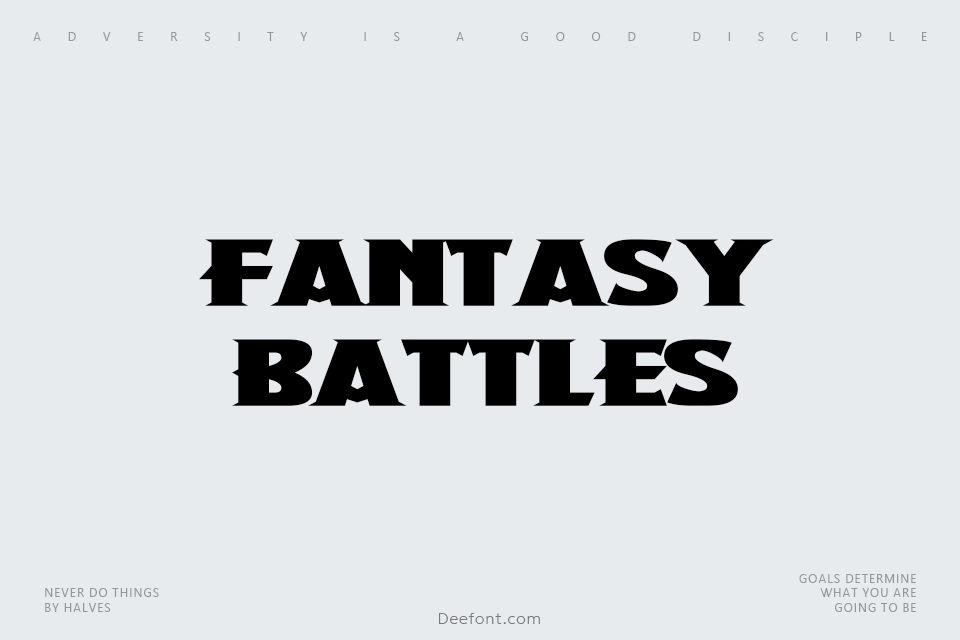 Fantasy Battles is a bold, contemporary gothic display font created by Hawtpixel through Hawtpixel. This striking typeface combines traditional gothic aesthetics with modern design sensibilities, making it ideal for fantasy-themed graphics, gaming titles, and eye-catching headlines. With its robust and elegant strokes evoking epic adventures and mythical realms, the font seamlessly transitions across various design genres while maintaining effortless power and grace. Perfect for posters, book covers, and impactful branding projects that demand visual impact and memorable presence.