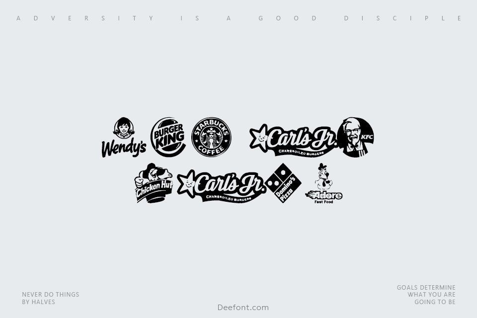 Fast Food logos is a bold and playful display font featuring 236 custom characters designed for brand recognition and signage. This dingbat collection combines thick strokes with rounded and geometric shapes, making it ideal for logos, menus, packaging, and advertising materials. The font’s modern and commercial aesthetic delivers eye-catching letterforms perfect for fast-food branding and decorative typography projects.
