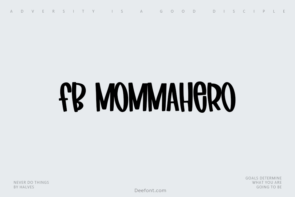 Fb Mommahero is a vibrant and playful display font that combines comic and fancy elements to create a distinctive typeface perfect for eye-catching headers and creative designs. With its charming, bouncy character, this font brings personality and fun to any project, making it ideal for posters, invitations, and decorative typography applications.